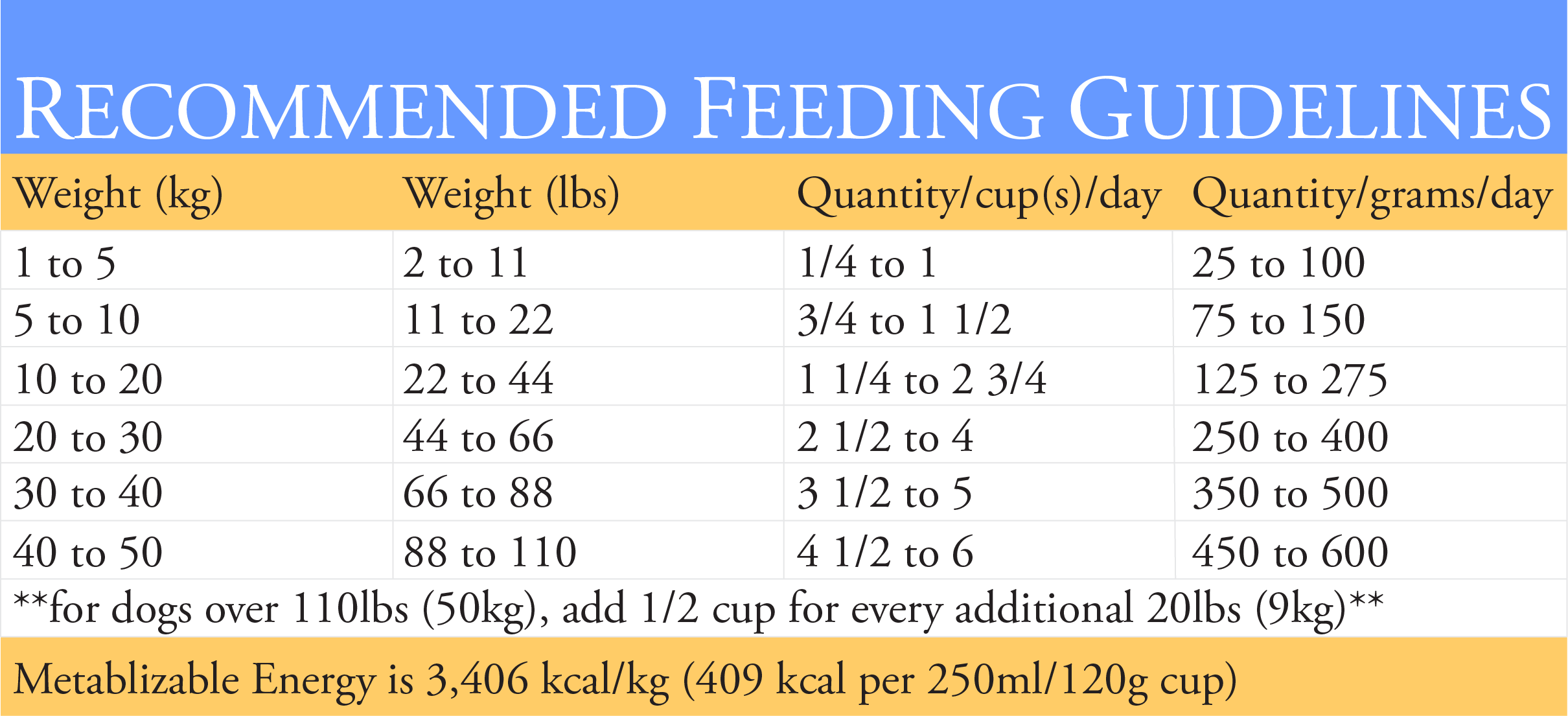 All dogs are different so amounts will vary depending on breed, age, activity level and climate. Use the feeding chart as a guide to achieve your dog's ideal weight. Puppies 1 1/2 to 3 months feed twice adult amount, 3-6 months feed 1 1/2 times adult amount, and 6-11 months feed 1 1/4 times the adult amount. Gestation increase by 25%-50%. Lactation, feed free choice. Serve dry or slightly moistened. Keep bag sealed. Store in cool dry place.